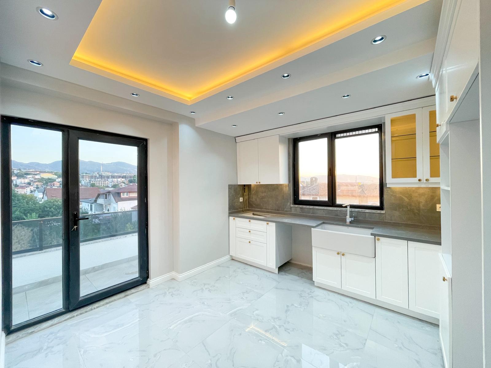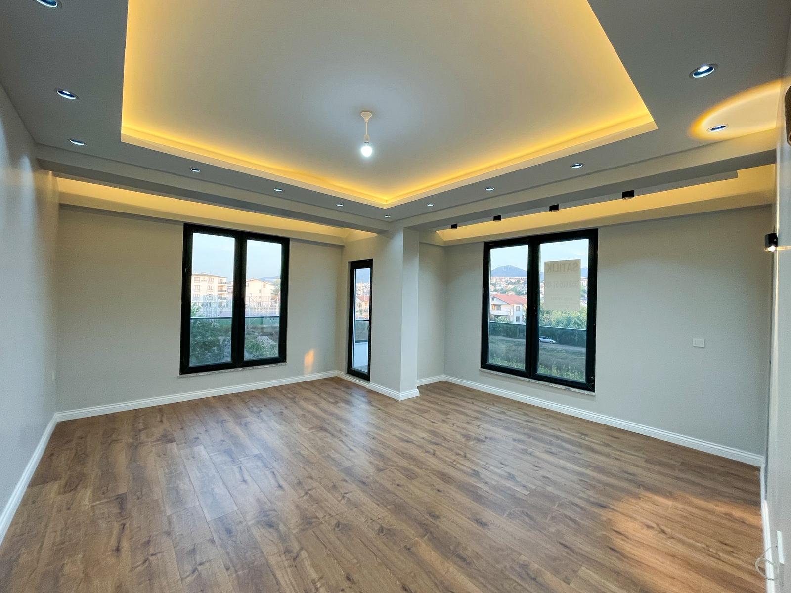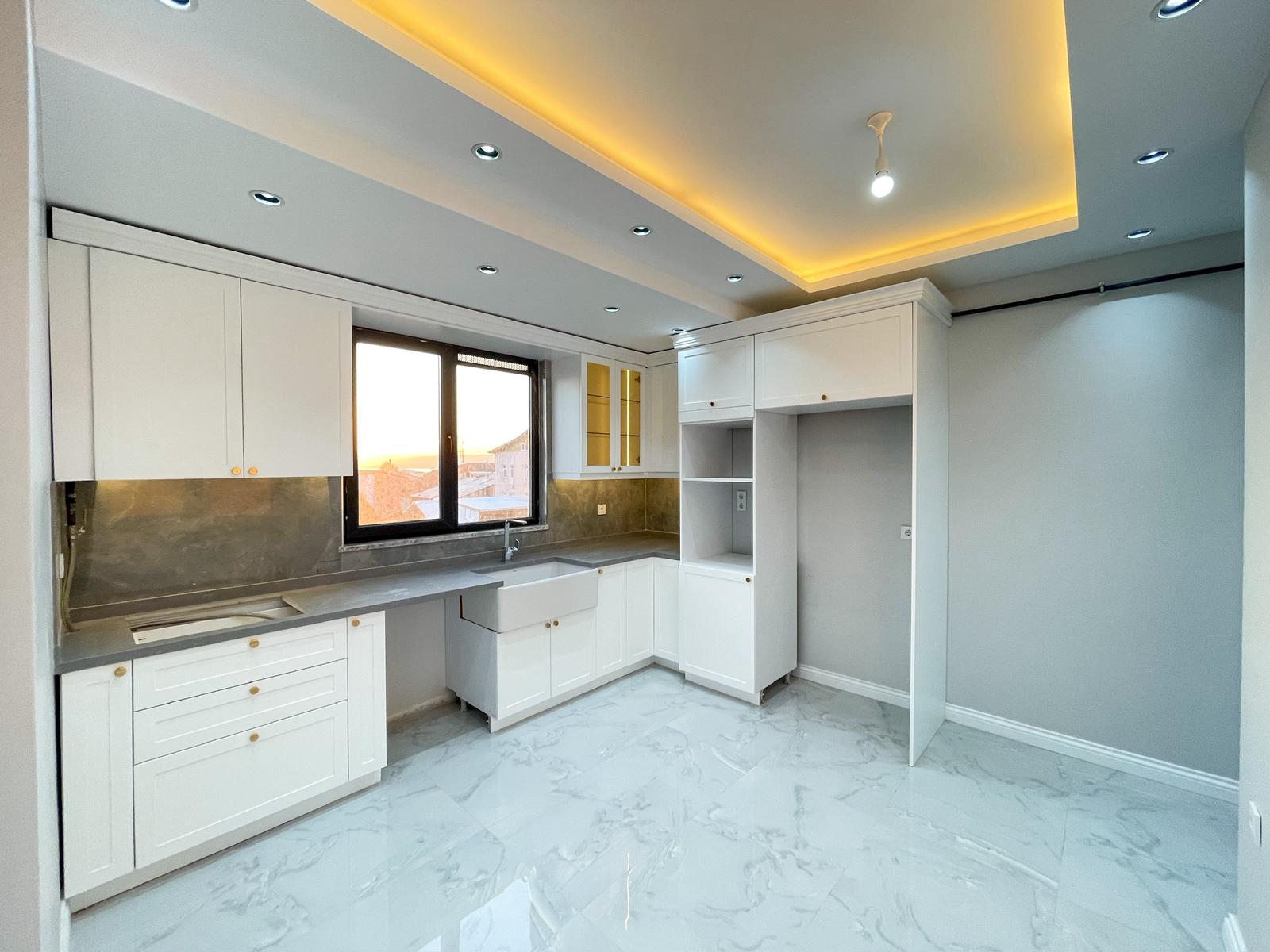 Modern tasarıma sahip geniş salon, şık tavan aydınlatmaları ve estetik detaylarıyla oldukça etkileyici bir yaşam alanı sunarken, açık plan mutfak ise hem kullanışlı hem de zarif tasarımıyla öne çıkmaktadır.